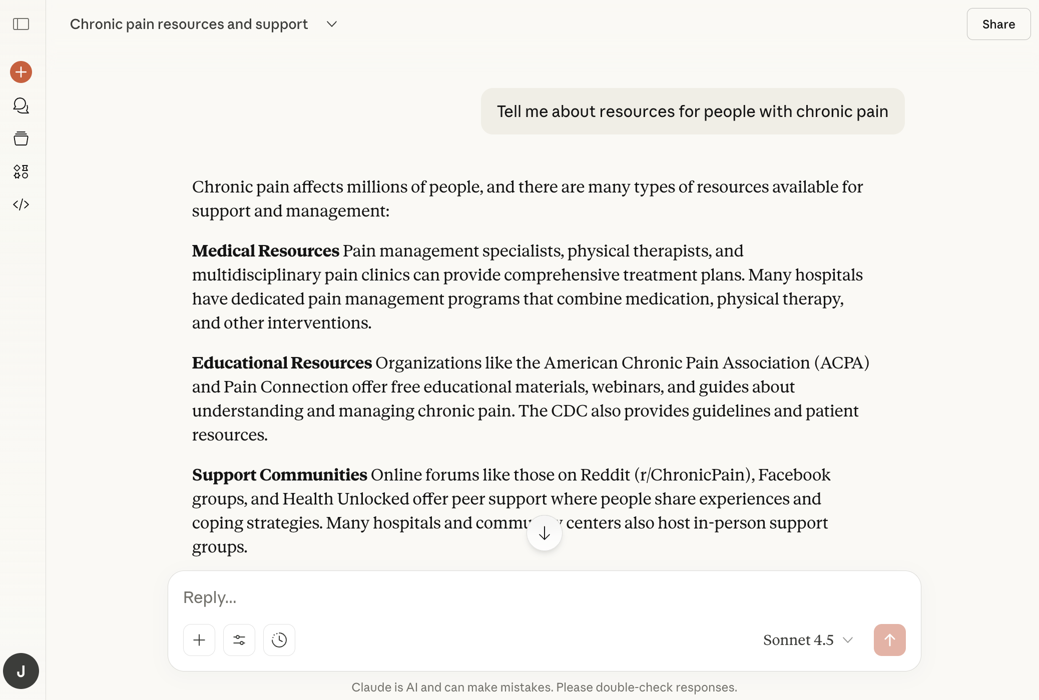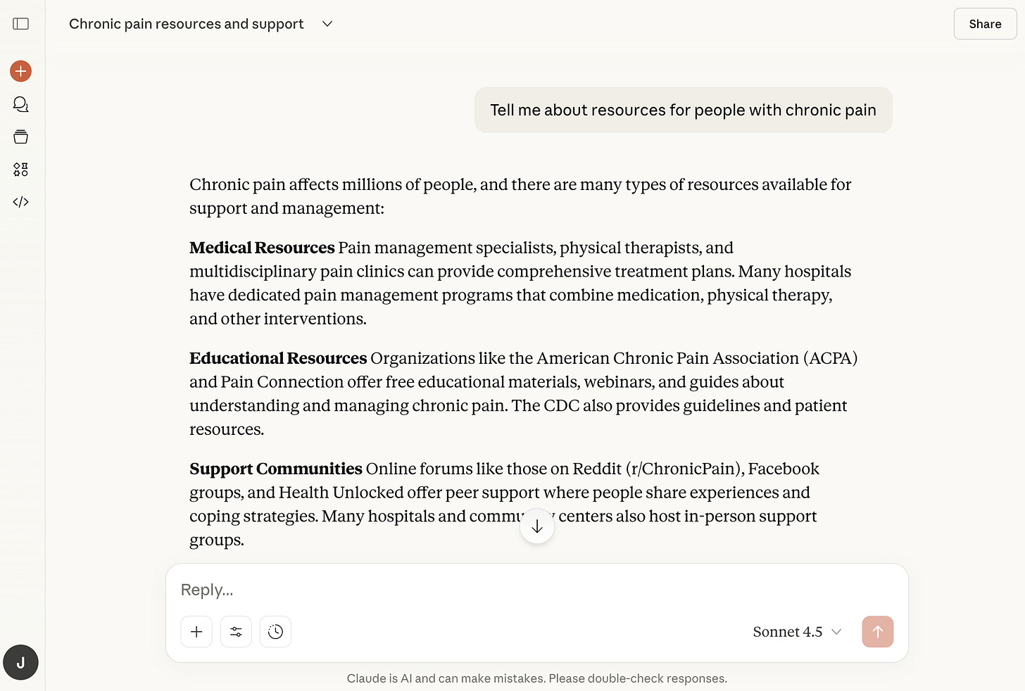 AI as a research assistant: Want to find news and information around chronic pain without searching the web yourself? Try asking AI! I asked Claude, “Tell me about resources for people with chronic pain,” and it brought back details on medical resources, educational ones, support communities, apps and digital tools, even financial assistance. Obviously we know the Chronic Pain Project is a nonprofit supporting those with chronic pain, but for fun I asked Claude to tell me other foundations and nonprofits in the space. In just seconds, it returned organizations I hadn’t heard of but will definitely check out. What are your favorite AI prompts? Let us know in the comments.